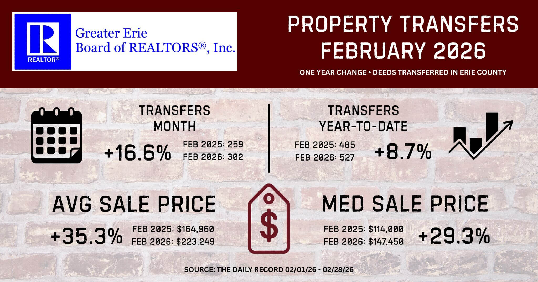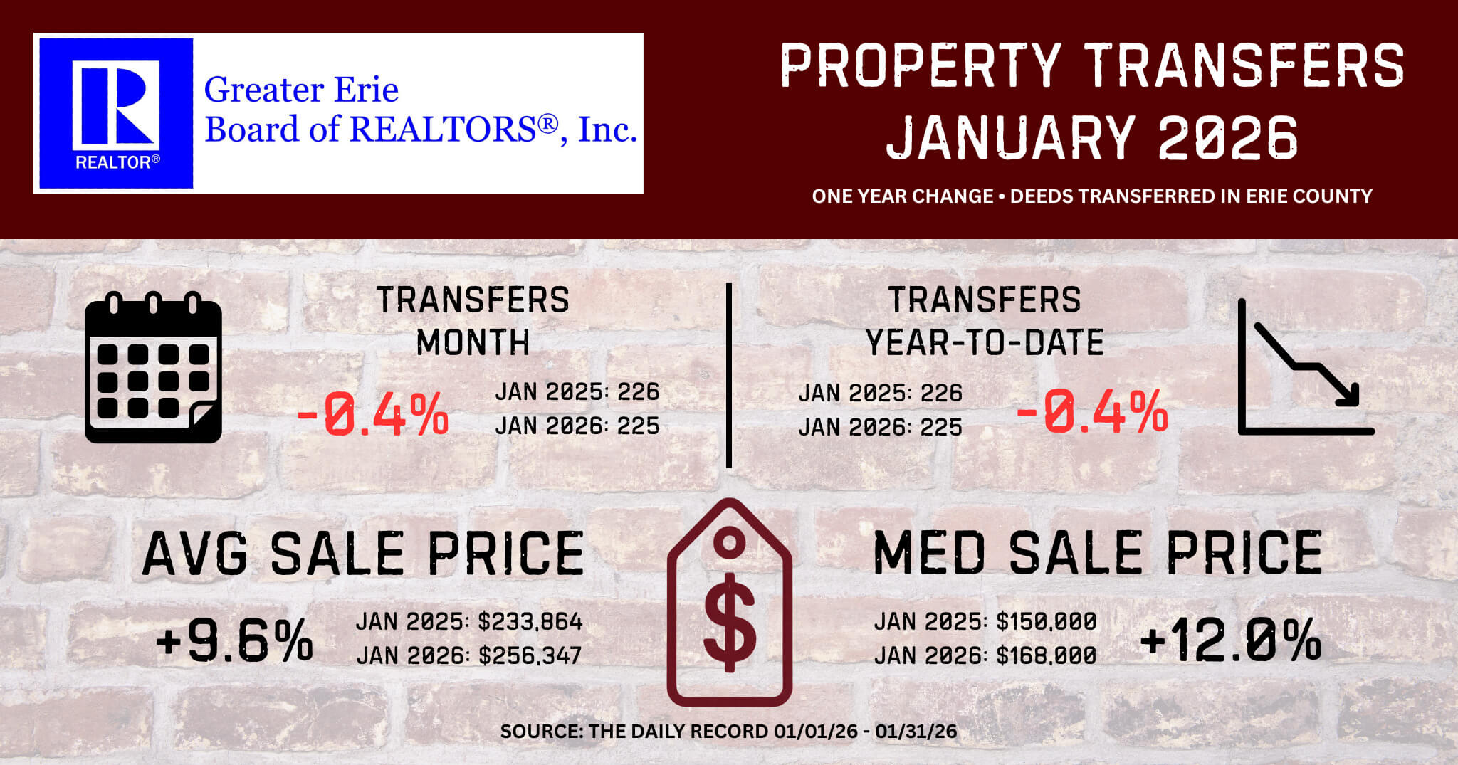 The information in the Property Transfer Reports and Infographic is licensed and prepared only for reference for members of the Greater Erie Board of REALTORS®. Only members with their own license for this data who have requested GEBOR's permission and been authorized may share this Infographic. All other public dissemination is prohibited.